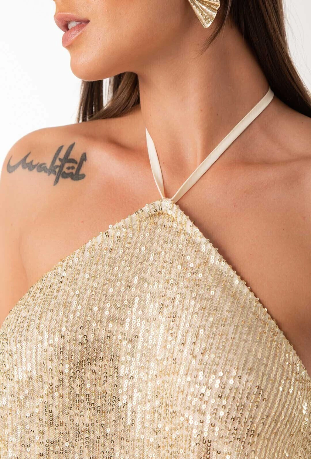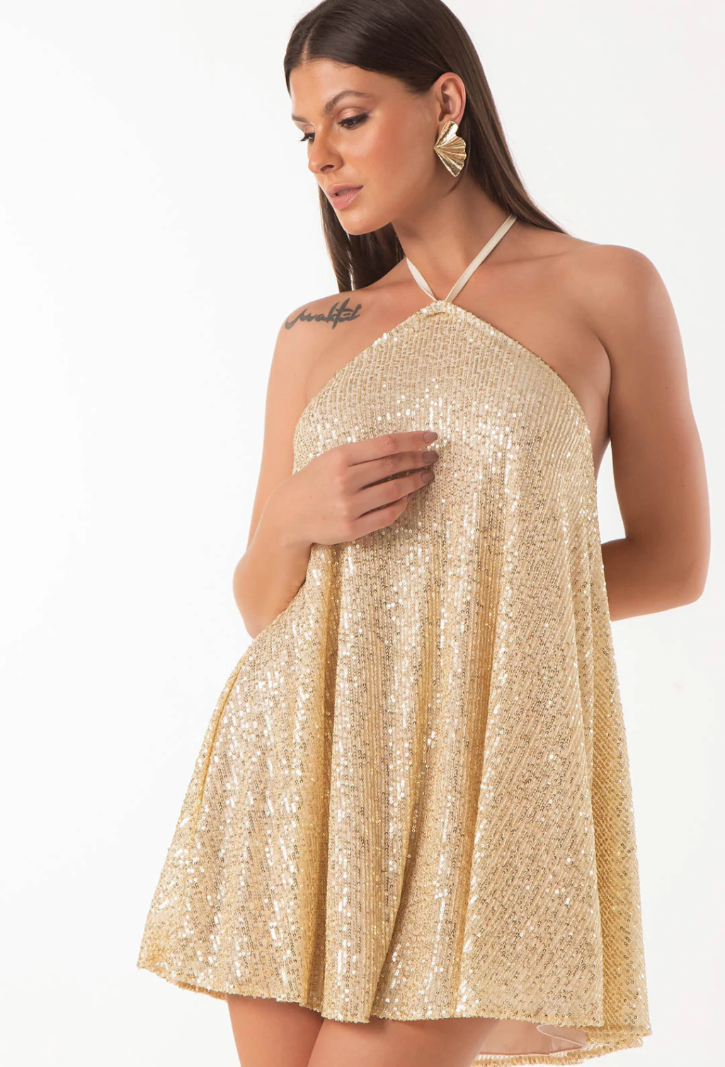 Vestido confeccionado em malha de paetê com frente trapézio e modelagem soltinha no corpo. Possui alça fina no pescoço com acabamento em ponteiras. Nas costas a peça fica com um decote mega charmoso. Uma peça perfeita para curtir as festas de fim de ano com muito glamour.